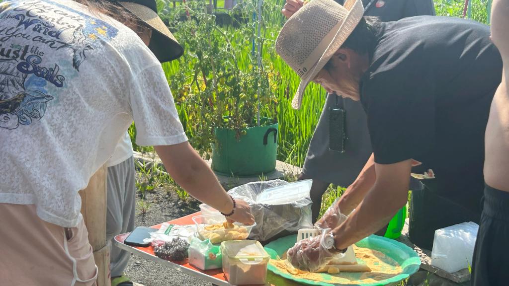 下午,团队来到村文化活动中心体验打糕制作。在村民指导下,队员们轮流抡起木槌捶打糯米,从生疏到熟练,切身感受传统美食的制作工艺。随着糯米逐渐变得绵软柔韧,队员们将打糕裹上黄豆粉,切成小块品尝。香甜软糯的口感中,饱含着劳动的喜悦和对传统文化的敬意。