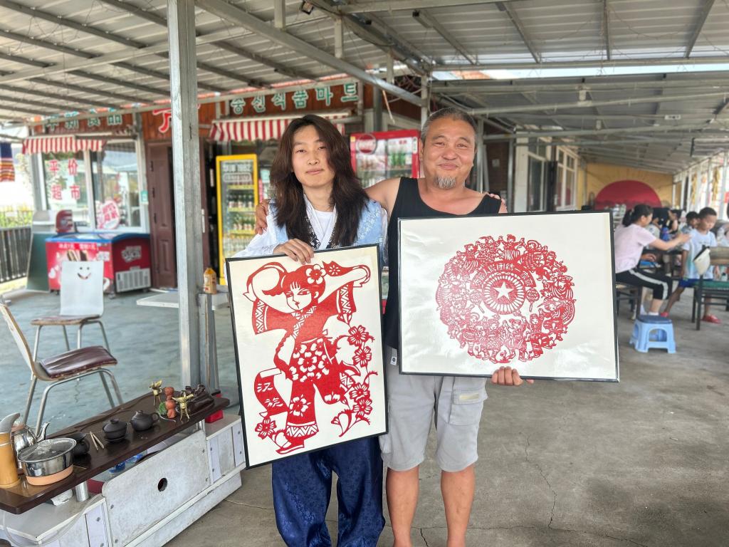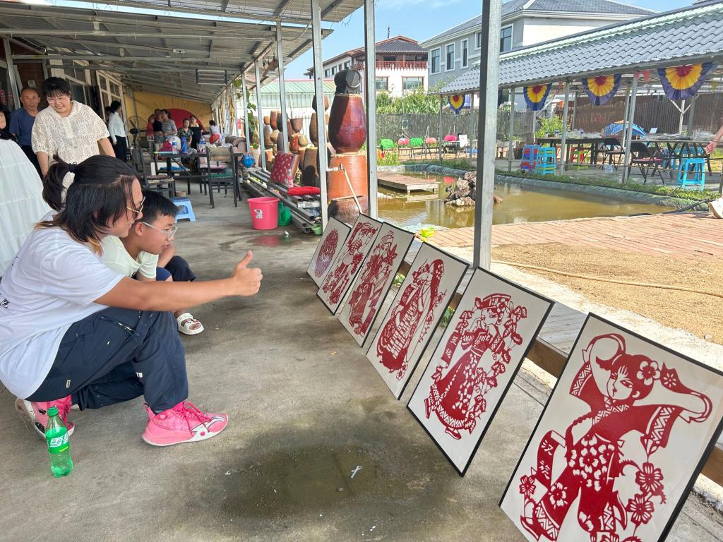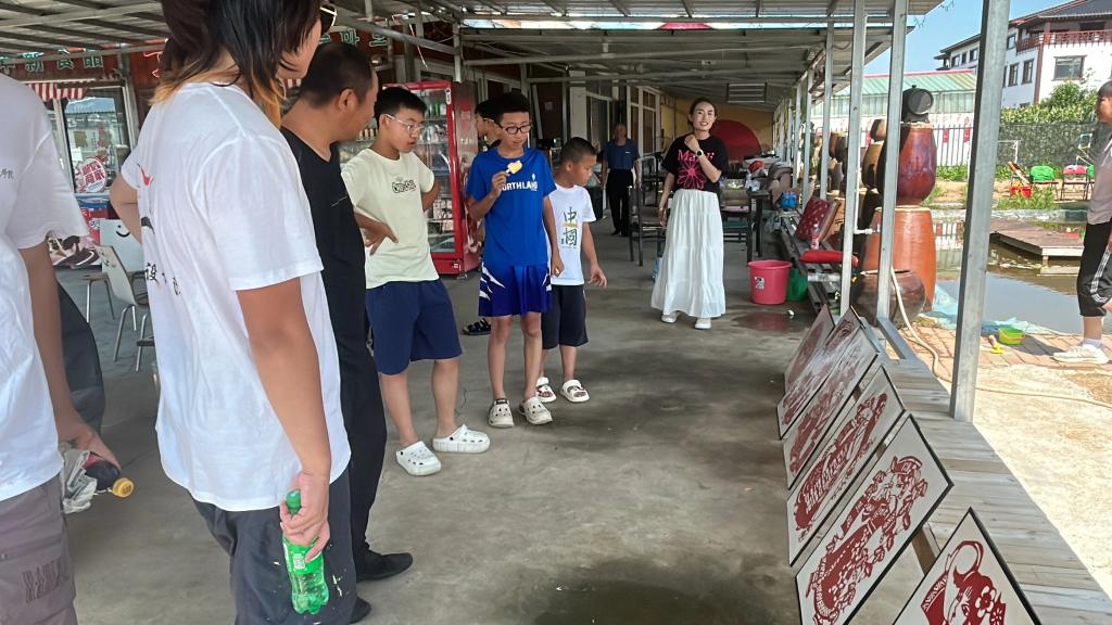 在民族文化展示环节,志愿者们精心筹备了一场民族剪纸作品展。同学们以剪刀为笔、红纸为墨,创作了汉族、朝鲜族、蒙古族、维吾尔族等多个民族的剪纸作品。这些作品或展现身着民族服饰的歌舞场景,或刻画特色劳作画面,线条流畅细腻,人物神态生动传神。展览不仅为村庄增添了艺术气息,更通过剪纸艺术传递了民族团结的深厚情谊。